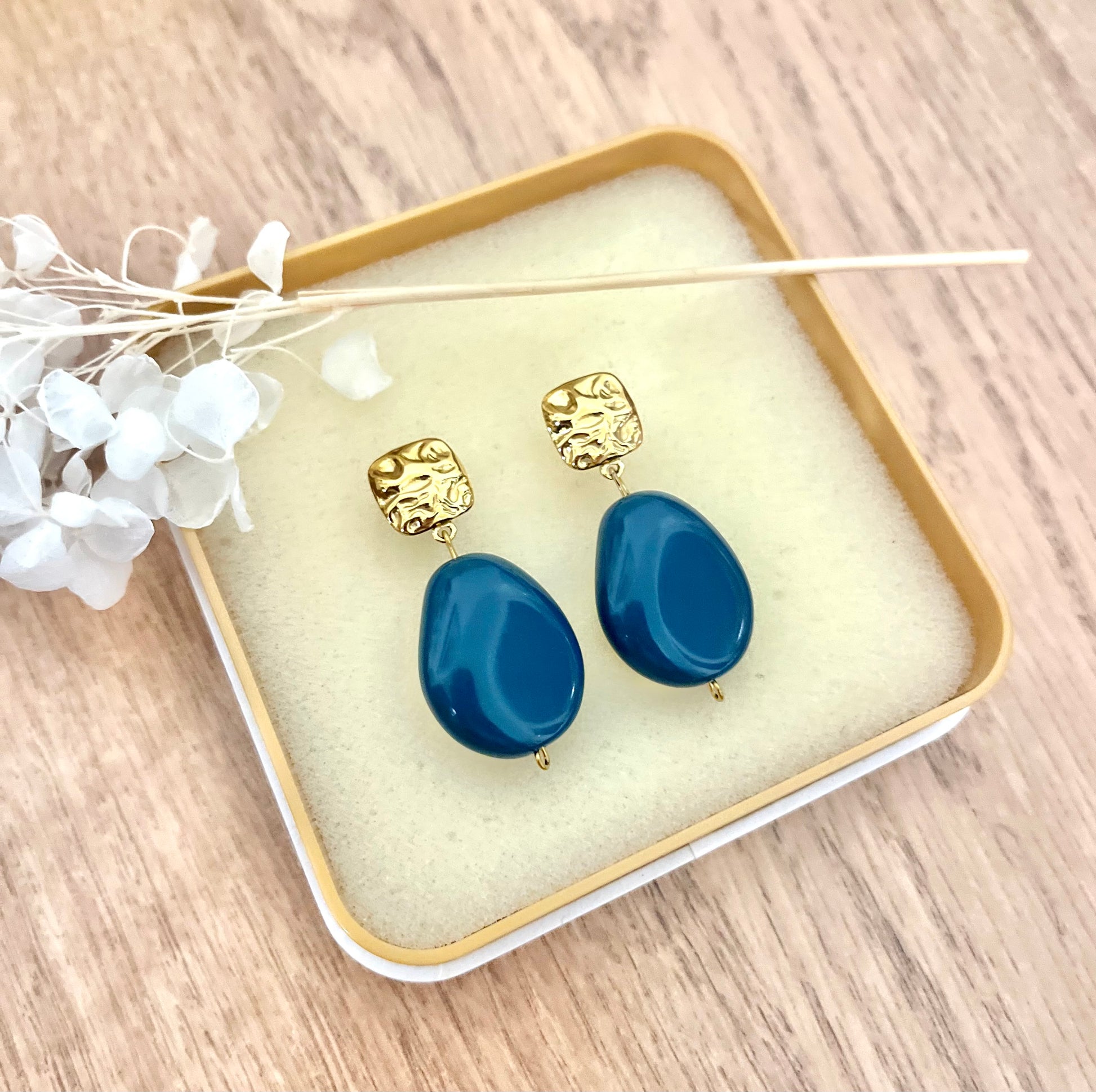 Boucles d’oreilles Iparla -Carré doré martelé & Pendentif goutte bleue paon
