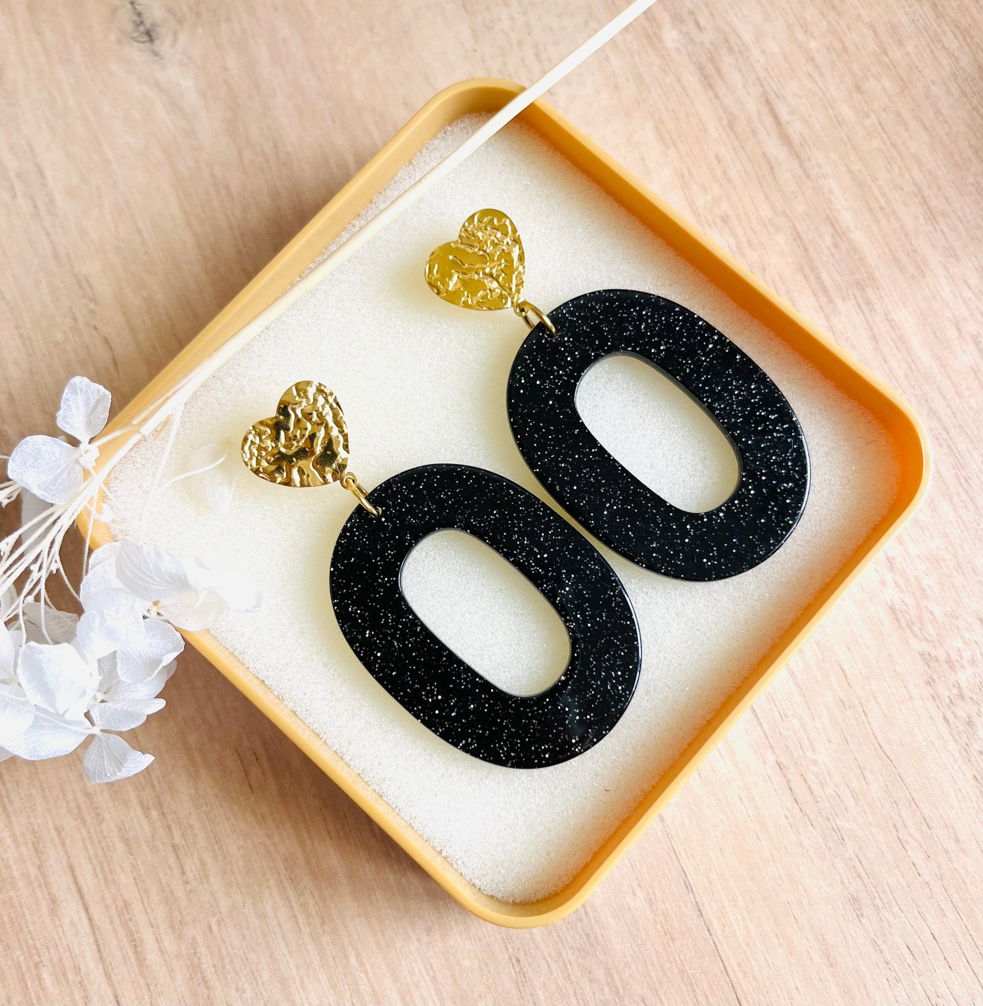 Boucles d’oreilles Lescar - Coeur doré martelé & Ovale noir pailleté